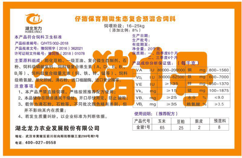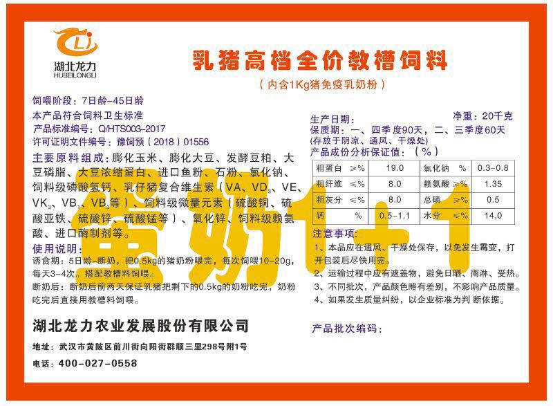 湖北龍力農(nóng)業(yè)發(fā)展股份有限公司坐落于武漢市黃陂區(qū)前川街向陽街群順三里298號附1號。公司成立于2014年6月,公司自成立以來把“創(chuàng)全球最大養(yǎng)豬綜合服務”為企業(yè)愿景。致力于打造教保料品牌”作為公司發(fā)展的明確目標。公司一直致力于豬營養(yǎng)的研究和開發(fā),積極與國內(nèi)外高校和科研機構(gòu)合作,推廣養(yǎng)豬技術(shù)、動物營養(yǎng)新概念,向世界農(nóng)牧企業(yè)學習與合作。公司采用國內(nèi)先進的生產(chǎn)工藝,選擇高精度電子配料秤,高均勻度、無殘留混合機等先進設備....